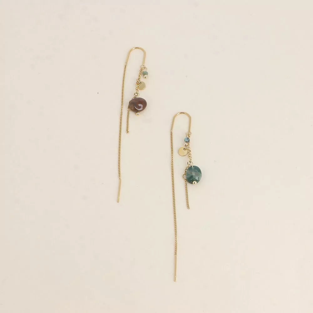 Boucles d'oreilles pendantes en acier inoxydable composées de 2 chaînes pendantes, de pierres naturelles et d'une petite pampille ronde.