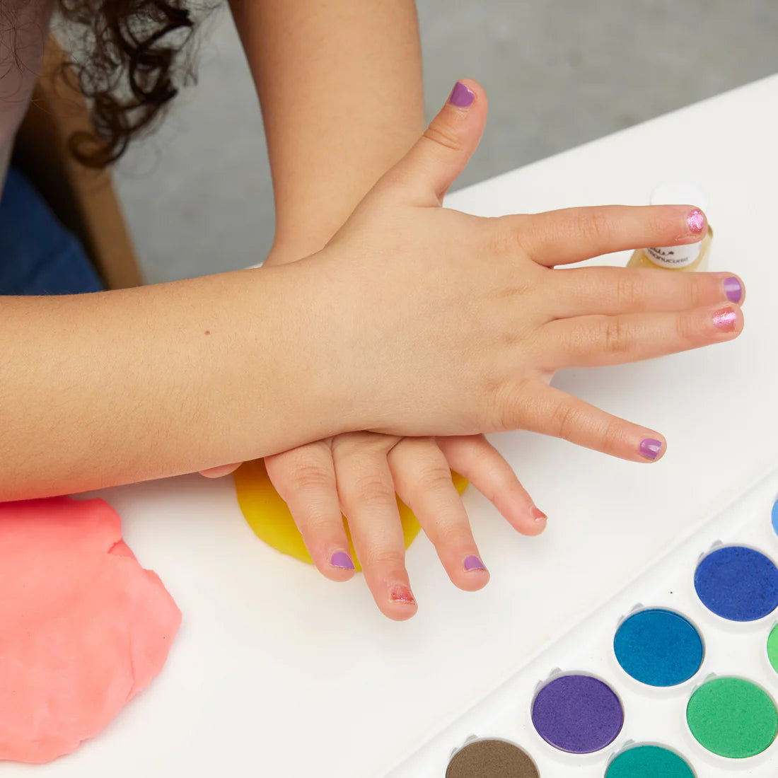 Un coffret de vernis à ongles pour enfant composé d'un bleu pailleté, d'un rose pâle pailleté et d'un mauve pailleté. Nos vernis Petite Manucurist ont une formule si pure que les enfants peuvent les utiliser sans risque et les retirer à l'eau savonneuse.