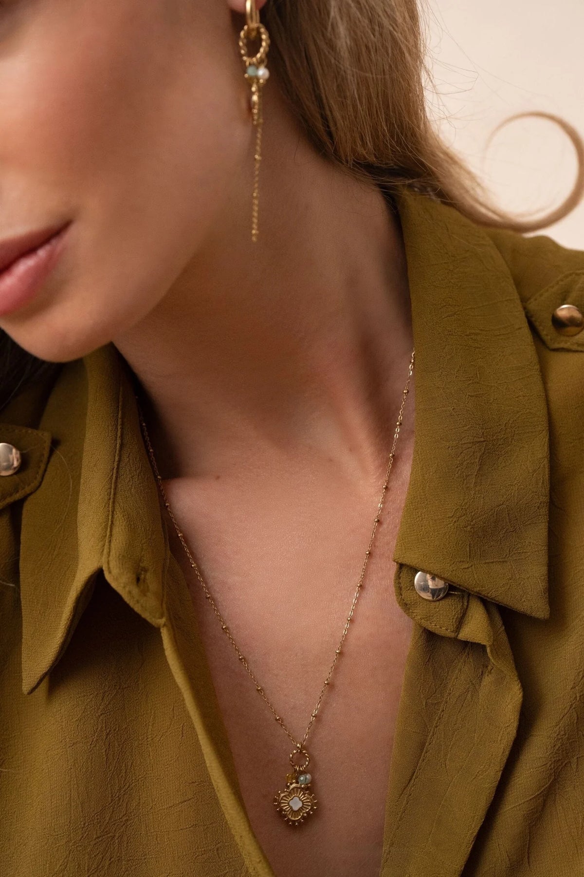 Collier sur chaîne avec boules en acier inoxydable composé d'un anneau torsadé sur lequel sont accrochées des pierres naturelles et un pendentif en forme de trèfle texturé et émaillé.